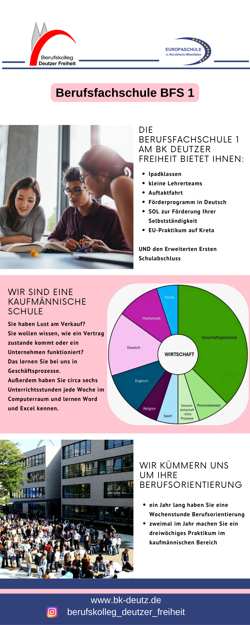 Im Januar und gegen Ende des Schuljahres nehmen die Klassen an zwei dreiwöchigen Betriebspraktika im kaufmännischen oder verwaltenden Bereich teil.